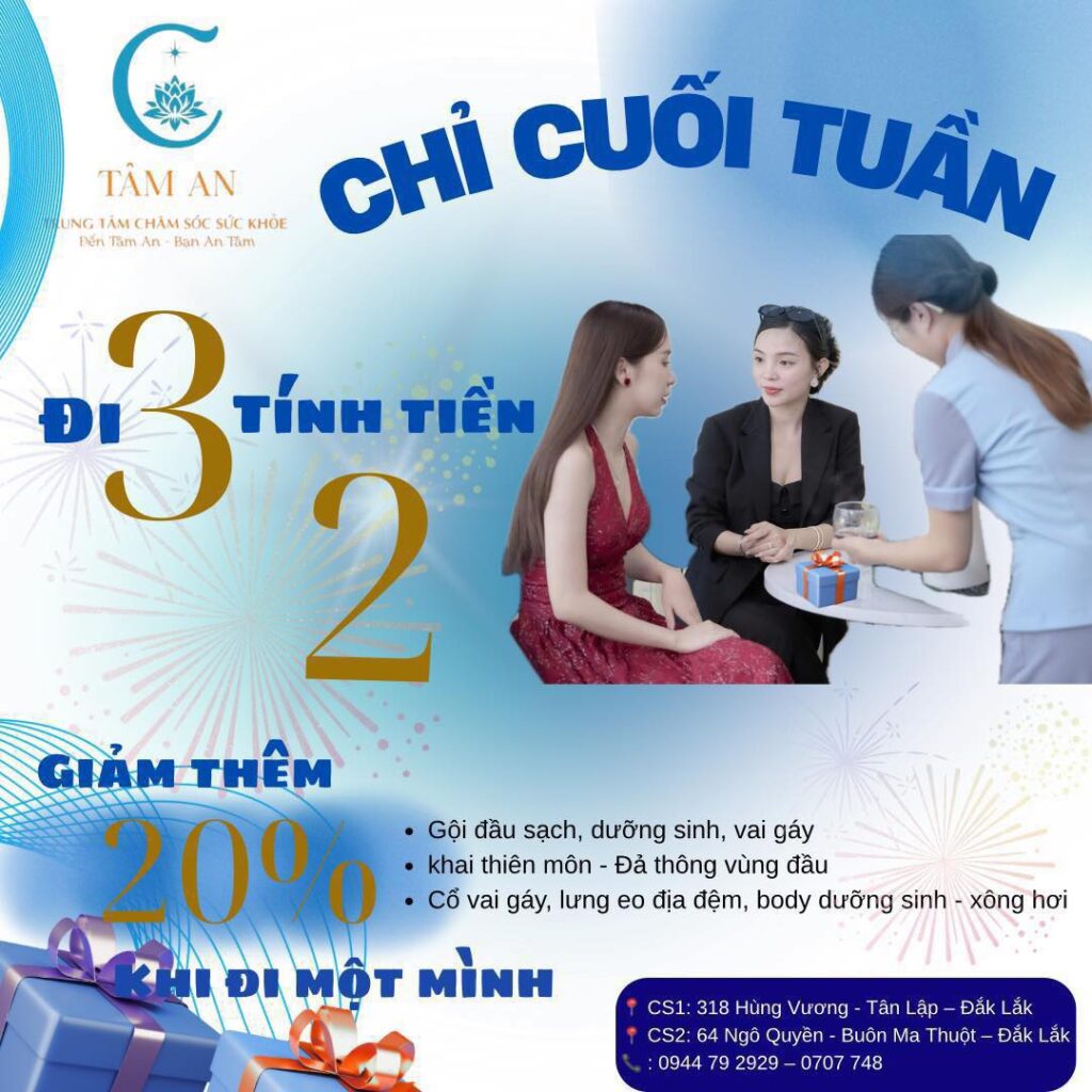 Cuối tuần là thời điểm lý tưởng để cơ thể được nghỉ ngơi và tái tạo năng lượng. Hãy tận hưởng trọn vẹn những phút giây thư giãn tại Tâm An Spa Buôn Ma Thuột với ưu đãi đặc biệt: Đi 3 người chỉ tính tiền 2 hoặc giảm thêm 20% khi đi một mình.